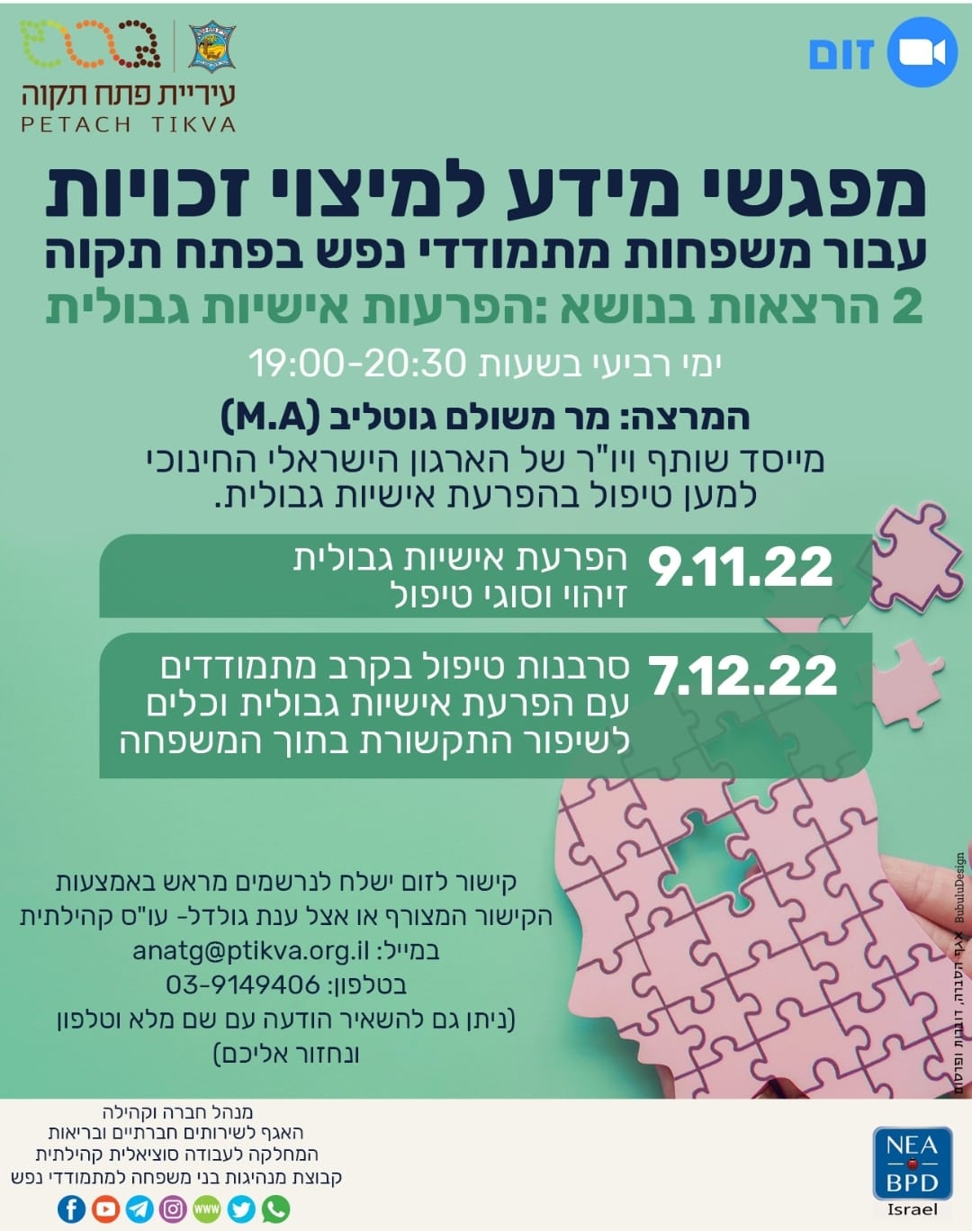 Lecture on Living in the Shadow of Borderline Personality Disorder in honor of Israeli BPD Awareness Month given in collaboration with Ezer Mizion, The Department for Mental Health, Mercaz Yeutz le-Mishpachot, Jerusalem